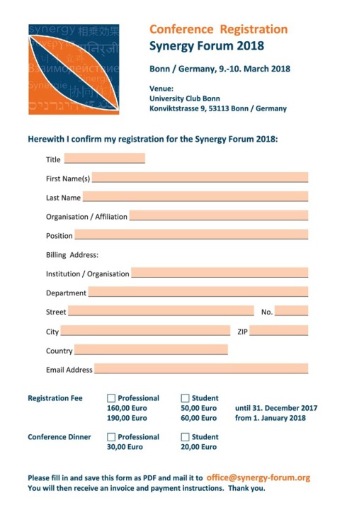 Please download the registration form (via the download link), fill in all required details, save it as PDF file and send it by Email to office@synergy-forum.org. You will then receive an invoice and payment instructions. Participants from outside Europe may pay in cash (Euros only !) upon their arrival at the reception desk of the conference venue.